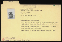 | Description: | Complete except for most of mouth and handle, now restored in plaster. Small hole in lower body. Band handle, trefoil mouth, plain foot. Glazed with banded, reserved zone. Glaze brown to black, much worn; pinkish clay. Subgeometric. | |