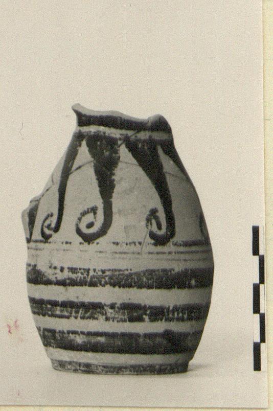 Description:   Mouth and handle missing. Four joining fragments. Flat foot; rather oblong body, narrowing at neck, and with a ridge near foot. Decorated with hanging hooks at upper body, and three narrow and four wide horizontal bands on lower body.