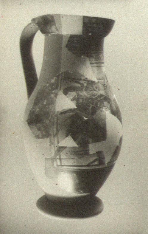 | Description: | Mended from many pieces. The base, back and handle below lip, entirely missing and parts of the figured panel. Restored in plaster. At top of panel, on lip, checkerboard; on neck, single maeander and looped zigzags with bands between. Sides bordered by two black bands, bottom by one. On the lip, on each side of the handle attachment, a projecting ear. The neck glazed inside for ca. 0.04m. from the top. Figured zone depicts Herakles in lion skin, with drawn sword, charging right toward an Amazon who has fallen on one knee. She wears a high-crested helmet. Her companion, at the extreme right of the picture, wears a high Persian cap with long tails. Vines in field. White for the flesh of the Amazons, a stripe on helmet crest and garment border and details on Herakles' short chiton and lion skin(?). Red for tails of Amazon's cap, border of shield, Herakles' sword, and ornament on garment. Red also (the actual color entirely gone) on his hair and beard. | |