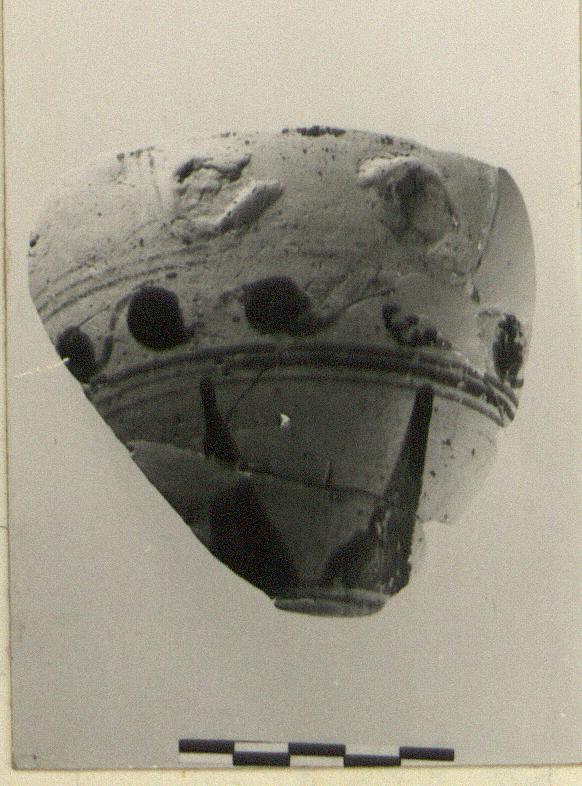 | Description: | Four joining fragments, held together with plaster, preserve complete profile and handle attachments. In handle zone, vertical lines. Below, three bands, connected dots, three bands, rays. Brown glaze, pink clay. | |
