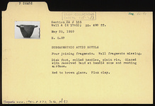 | Description: | Four joining fragments. Wall fragmens missing. Disk foot, rolled handles. Plain rim. Glazed with reserved band at handle zone and resting surface. Red to brown glaze. Pink clay. Subgeometric, Attic. | |