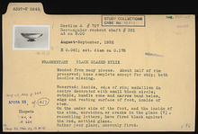 | Description: | Mended from many pieces. About half of rim preserved; base complete except for chip; both handles missing. Reserved: inside, edge of rim; medallion in center decorated with small black circle; outside, handle zone and narrow band below, edge and resting surface of foot, inside of stem. On the underside of the foot and the inside of the stem, scratches or cracks in the glaze, resembling letters, have fired black against the red, mottled glaze. Rather poor glaze, unevenly fired. Cf. Agora XII, no. 417. Cf. Hesperia 55 (1986), p. 15, no. 15. | |