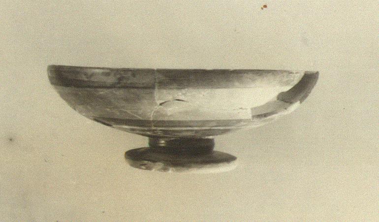 | Description: | Mended from many pieces. About half of rim preserved; base complete except for chip; both handles missing. Reserved: inside, edge of rim; medallion in center decorated with small black circle; outside, handle zone and narrow band below, edge and resting surface of foot, inside of stem. On the underside of the foot and the inside of the stem, scratches or cracks in the glaze, resembling letters, have fired black against the red, mottled glaze. Rather poor glaze, unevenly fired. Cf. Agora XII, no. 417. Cf. Hesperia 55 (1986), p. 15, no. 15. | |