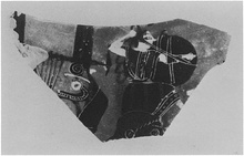 | Description: | Fragment from upper part of figured panel. Athena right, springs from head of Zeus. Behind her, large cithara. Red for hair of Zeus, stripes on Athena's dress and on frame of cithara. White for Athena's flesh, dots on the hem of her dress, details of cithara, some object to right of Athena. | |