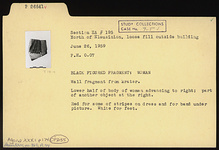 | Description: | Wall fragment from a krater. Lower half of body of woman advancing to right; part of another object at the right. Red for some of stripes on dress and for band under picture. White for feet. | |