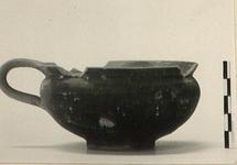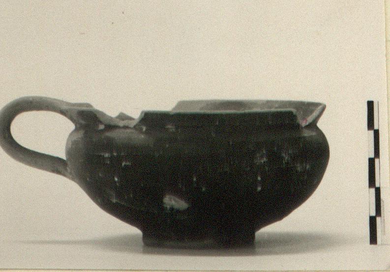 | Description: | Complete except for two small holes at side and missing lip fragments. Offset rim; band handle; disk foot. Glaze red to brown, over all. Pinkish-buff clay. | |