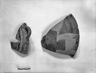 | Description: | Many fragments, strengthened with plaster, preserve part of rim and wall; also one handle. Rolled handle attached at plain rim. Inside glazed with broad band of added red; outside banded alternately with glaze and red. Zigzag band at rim. Orange to red glaze. Pinkish clay. | |