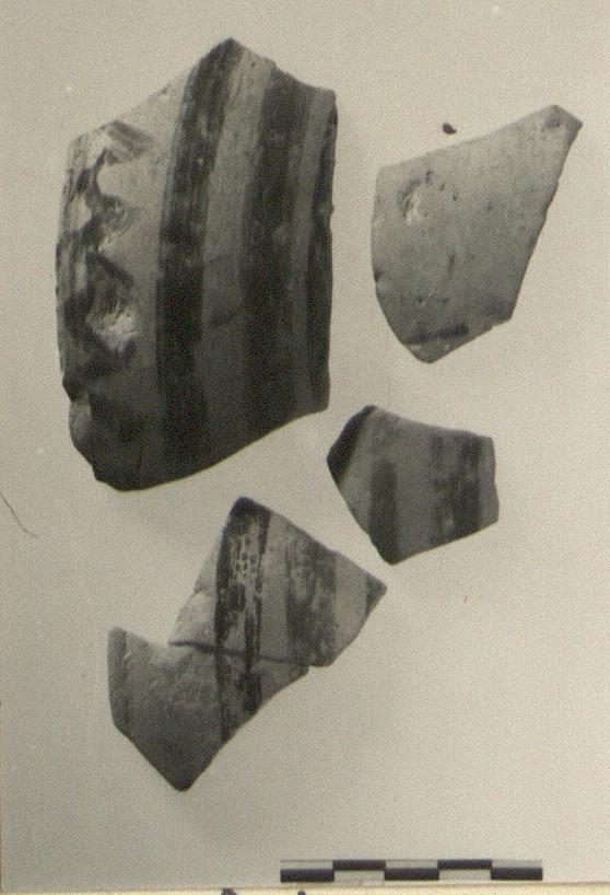 | Description: | Many fragments, strengthened with plaster, preserve part of rim and wall; also one handle. Rolled handle attached at plain rim. Inside glazed with broad band of added red; outside banded alternately with glaze and red. Zigzag band at rim. Orange to red glaze. Pinkish clay. | |