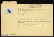 | Description: | Some of upper body and a little of shoulder of vase preserved. Tail of cock to right; broad red stripe on tail. Above, simple maeander running right. On shoulder, stems of lotus buds. | |