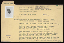 | Description: | Mended from six pieces; upper half and foot missing. Combat scene with warrior running left, sword drawn, looking right. To his right, Athena right, a falling warrior (giant?), and a warrior, left. This last warrior almost completely preserved; the upper parts of the others are missing. White for flesh of Athena, for dots on garment, ornament on shields and other armor of warriors. Red for dots on Athena's dress, for rims of shields and crest of helmet and for dots on other armor. Three lines of red on glaze beneath scene | |