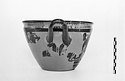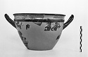 | Description: | Foot missing; upper part mended from numerous fragments and restored in plaster. High bowl, concave lip, steeply canted handles, from shoulder to above rim. A: Left to right: figure moving right; looking back over shoulder; bearded man seated on small chariot, pulled by two horses, facing right; olive tree in background; bearded male touching horses' heads, facing left; bearded male moving right, looking back over shoulder. B: Left to right: draped female moving right; second figure moving right; much of center missing except for shoulder and back of head of figure moving right; upper half of bearded male moving right, looking back; upper half of bearded satyr moving right, looking left; olive tendrils in background. Figures in black with incised detail and added purple; diluted glaze for limbs, faces, spots on horses. Decoration of lower wall: elongated tongues surmounted by bands of glaze. Decoration of lip: two rows of ill-defined vine leaves. Generally good black glaze; Attic clay. | |