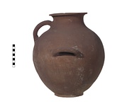 | Description: | Household Hydria. Lip chipped. Vertical handle broken but preserved. Very rotund shape. Ring foot, flat projecting rim. Fine slip much worn. Reddish-brown micaceous clay. | |