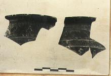 | Description: | Five pieces make up two fragments of rim and wall. Elaborate rim pattern, alternating lotus and lily. Ovules above, spirals below. Upper wall, guilloche. Scraped groove filled with pink. Very fine work. Firm black glaze; pink clay. Cf. P 27436. Cf. Hesperia 75 (2006), p. 372, n. 52. | |
