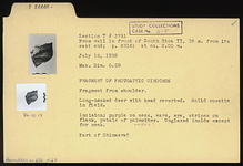 | Description: | Fragment from shoulder. Long-necked deer with head reverted. Solid rosette in field. Incision; purple on neck, ears, eye, stripes on flank, petals of rosettes(?). Unglazed inside except for neck. Part of Chimaera? | |