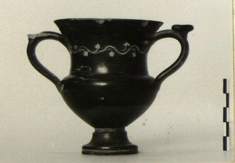 | Description: | Fragments missing from lip, wall and one handle. Strap handles with ivy leaves. Wreath in thinned clay around upper wall. Black glaze fired red around lower wall and base outside and over lower wall inside. Pinkish clay. | |