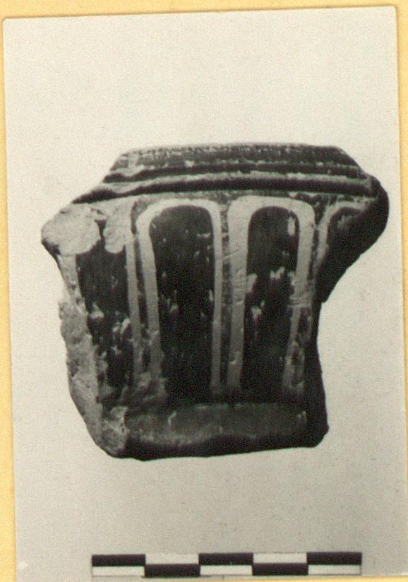 | Description: | A single fragment gives profile of rim and a bit of the floor and ring base. On rim, tongues, alternately red and black. Deep grooves near edge of rim. Scraped groove above base and reserved band just below the rim and resting surface. Worn black glaze; reddish clay, gray at core. | |