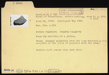 | Description: | From the shoulder of a pithos. Three stamped palmettes from the zone decorating the shoulder at the point of junction with the neck. Reddish-buff coarse clay with bits. | |