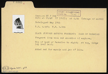 | Description: | Fragment from neck and shoulder of amphora. Top of head of Herakles to right; at top, large ivy leaf band. Added red for muzzle and jaw of lion. | |