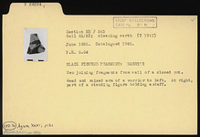 | Description: | Two joining fragments from wall of a closed pot. Head and raised arm of a warrior to left. At right, part of a standing figure holding a staff. | |