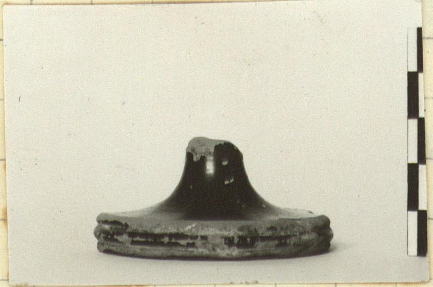 | Description: | Part of lower stem and base with edge chipped. Slender stem. Edge of base profiled. Underside has central, conical depression. Fully glazed. Firm black glaze; orange clay. For shape see CV A Brussels III L and III N, pl. 3, nos. 7, 11, 22. | |