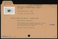 Description:   Nearly half preserved; convex sides. The bottom, very slightly convex, is set a little above the lower edge of the wall which serves as the base. Resting surface reserved.