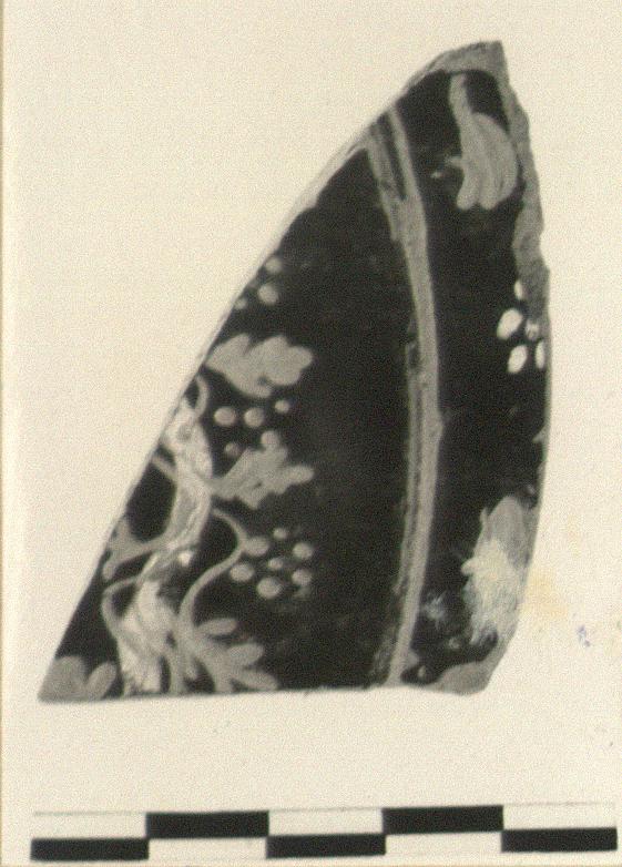 | Description: | Fragment from wall. Hemispherical bowl, grooved outside. Inside, in applied clay and white, a zone of grapevine below, and one with dolphins and dot rosettes above. Fully glazed. | |