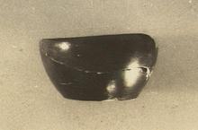 | Description: | Mended from three pieces; a fragment from one side and chips from the rim missing. Convex sides. The convex bottom is set above the lower edge of the wall which serves as the base. The bottom, within the base is reserved, washed with pink and decorated wih two concentric circles of glaze and a central dot. | |