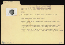 | Description: | Mended from many fragments; complete except for small pieces. Biconical with straight rim, flattened base; two lugs pierced horizontally set high on shoulder. Gritty buff clay with thin red burnished slip; mottled black and buff as if deliberately from coals. | |