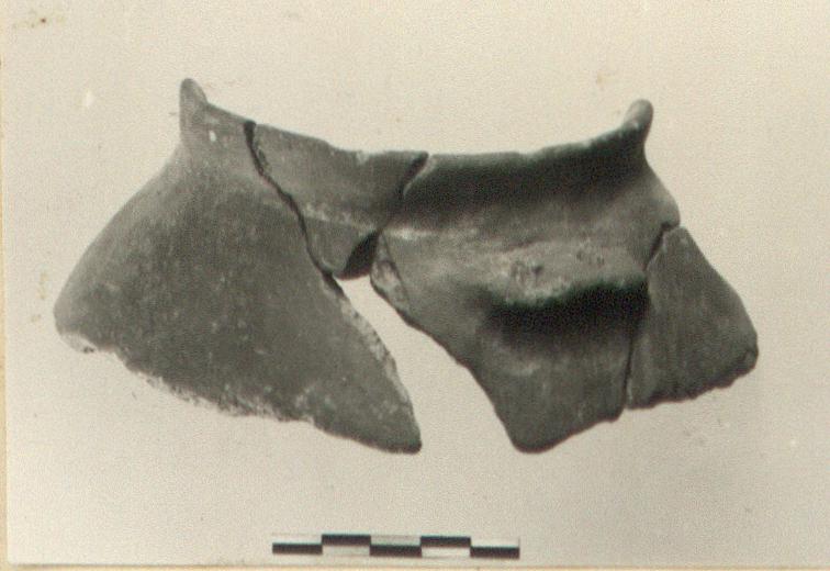 Description:   Fragment preserves about one-half of rim and one horizontal lug handle, pierced twice vertically. Ridges extend downward vertically from lug making inverted U attachment.