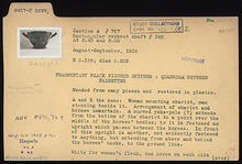 | Description: | Mended from many pieces and restored in plaster. Sides A and B the same: quadriga between palmettes. Woman mounting chariot with man standing beside it. Arrangement of chariot and horses uncertain. A curved yoke-pole(?) extends from the bottom of the chariot to a point over the middle of the horses' bodies; to it is fastened an upright which passes between the horses. In front of this upright is another, not evidently fastened to anything, but extending from above and behind the horses' backs, to the groundline. White for women's flesh, one horse on each side and parts of yoke(?) of chariot. Red for horses' manes, parts of harness and of chariot yoke(?); for fillet on men's heads, and ornaments on women's garments. Reserved: narrow band below handle zone, inside of rim, resting surface and space within foot; the latter decorated with three glaze circles around a central dot. | |