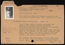 | Description: | None of the base, back or handle preserved and large pieces missing from lip and front. Restored in plaster; three fragments not included in restoration preserved separately. Possibly depicts boxers(?). Between the neck and shoulder of the vase, with the heads of the figures and the lower fragments, with their legs, there is no direct join so that the height of the vase and the proportions of the figures can only be conjectured. The rounded lip black glazed and the neck within for ca. 0.03m. Below the figures, two black glazed bands. There are no remains of other frames or borders; the figures seem to have been spread out over the whole front of the vase. Of the two figures, the male to the left has most of the head, the body from chest to hips, parts of his legs and of his left arm and his lower right arm. The male to the [right] lacks his left arm, fragments from body and legs and a small piece of his right arm. On the upraised hand and arm of the figure to the left are incisions suggesting a caestus. The right hand figure is bearded and wears a fillet. Brown wash. The glaze very irregularly fired from brownish red to black; the whole effect slovenly. ADDENDA More pieces, including right foot of left figure and pieces at back, found Nov. 1995 in tins of "coarse" pottery. | |