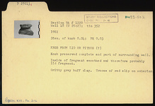| Description: | Knob preserved complete and part of surrounding wall. Inside of fragment smoothed and therefore probably lid fragment. Gritty gray-buff clay. Traces of red slip on exterior. | |