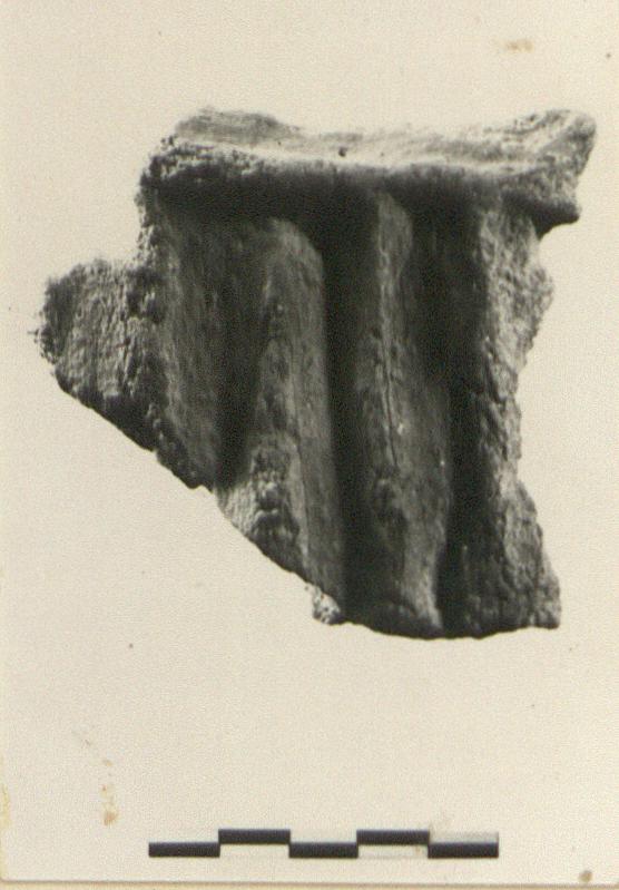 | Description: | Wall fragment with no edge preserved. One horizontal ridge, also five vertical ones preserved. Coarse gritty buff clay. | |