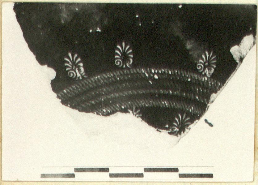 | Description: | Fragment of rim, floor and foot. Ring foot; wall moulded outside, rim rilled on top. On floor, broad rouletted band with palmettes above and below. The edge of a rouletted band on underside also. Shape D. Good black glaze all over, except resting surface, worn. | |