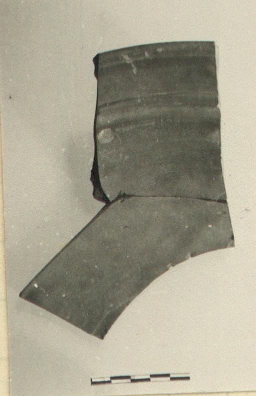 | Description: | Rim to base in two joining fragments. Center of floor missing; edge of a rouletted band preserved. Low base, mold with groove. Rolled rim, with bevelled moulding on interior. Deep red clay and slip; smooth surface. Late Roman Red Ware. | |