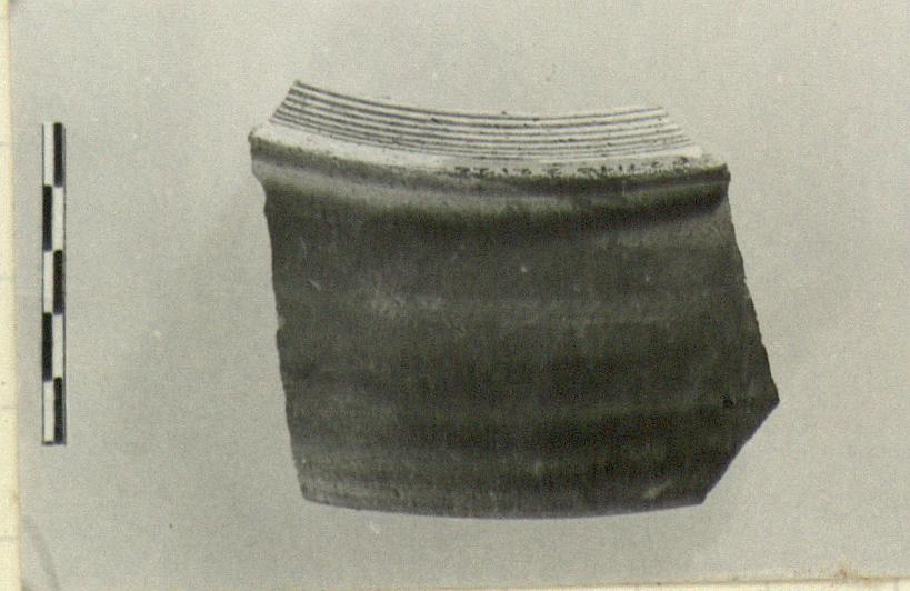 | Description: | Rim and wall fragment. Rim rolled on inside. Close-set grooves on bottom. Poor dull red-brown slip, blackened on upper part of outside. Late Roman Red Ware. | |