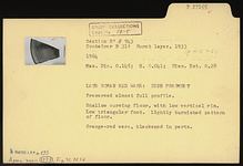 | Inventory Number: | | P 27155 | | Section Number: | | Η' 943 | | Title: | | Dish Fragment | | Category: | | Pottery | | Description: | | Almost full profile preserved of dish. Shallow curving floor, with low vertical rim. Low triangular foot. Lightly burnished pattern of floor. Orange-red ware, blackened in parts. Late Roman Red Ware. | | Notes: | | Cf. H-I 7-8:1. | | Context: | | Burnt layer, 1933. | | Negatives: | | Leica | | PD Number: | | PD 3083-127, DA 10001 | | Dimensions: | | Max. Dim. 0.145; H. 0.041; Est. Diam. 0.28 | | Date: | | 1964 | | Section: | | Η' | | Deposit: | | H-I 7-8:1 | | Lot: | | Lot Η' 31 | | Period: | | Roman | | Bibliography: | | Hayes (1972), no. 1, p. 135, type A, Form 87. | | | | Agora XXXII, no. 1129, fig. 35, pl. 56. | | References: | | Publication: Agora XXXII Drawing: PD 3083-113; PD 3083-114; PD 3083-115; PD 3083-116; PD 3083-117; PD 3083-118; PD 3083-119; PD 3083-120; PD 3083-121; PD 3083-122; PD 3083-123; PD 3083-124; PD 3083-125; PD 3083-126; PD 3083-127; PD 3083-128; PD 3083-129; PD 3083-130; PD 3083-131; PD 3083-132; PD 3083-133; PD 3083-134; PD 3083-135; PD 3083-136; PD 3083-137; PD 3083-138; PD 3083-139; PD 3083-140; PD 3083-141; PD 3083-142; PD 3083-143; PD 3083-144 (DA 10001) Deposit: H-I 7-8:1 Lot: Η' 31 Notebook: Η'-9 Notebook: Η'-12 Notebook: ΚΚ-13 Notebook Page: Η'-9-11 (pp. 1574-1575) Notebook Page: Η'-12-42 (pp. 2227-2228) Notebook Page: ΚΚ-13-23 (pp. 2536-2537) Card: P 27155