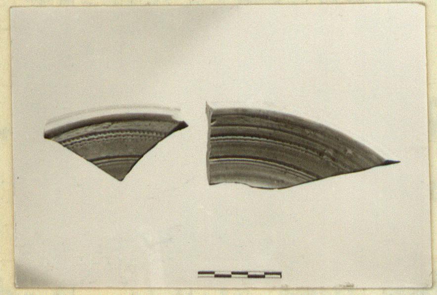 | Description: | Two non-joining fragments from rim and wall of Late Roman bowl. Several grooves and lines of rouletting on inside of wall; three grooves on outside. Short out-turned rim, slightly concave on top. Light orange clay, good light orange-brown slip. Imported. Cf. P 27166. | |