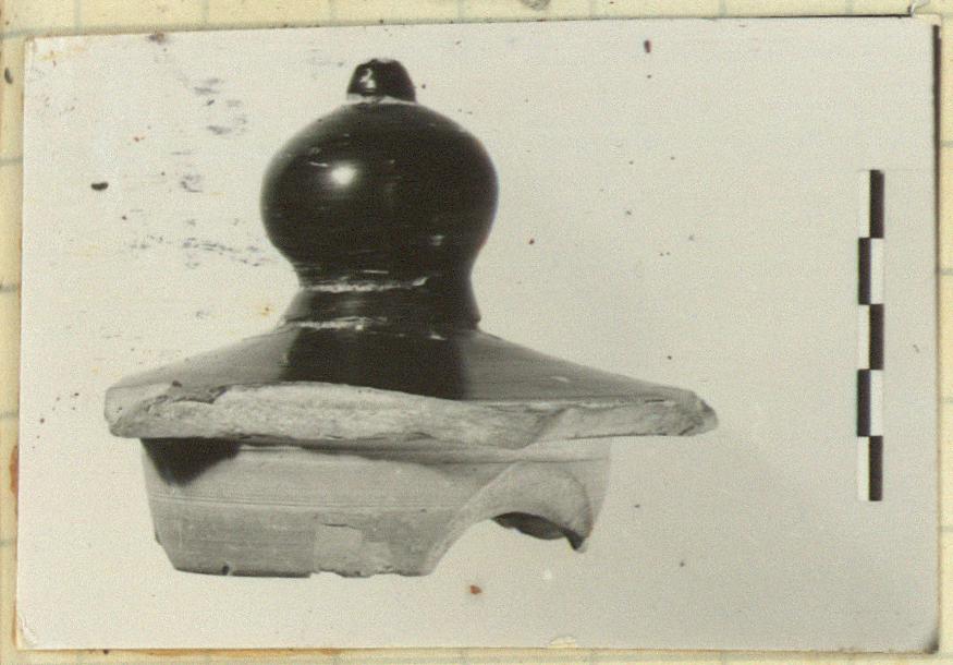 Description:   Much of flange of almost all of rim missing. Downturned flange set in from edge of rim. Knob and top surface black glazed. Trace of ivy pattern at preserved outside edge.