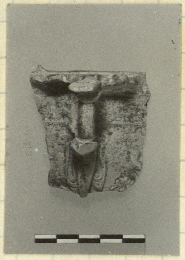 | Description: | Lead-glazed ware. Single fragment preserves part of rim and wall and one handle. Spurred handle. On wall, three ridges below which rosette in relief and upraised hand and arm to elbow. Vitreous lead glaze, mottled blue, green and brown. Cf. P 6820. | |