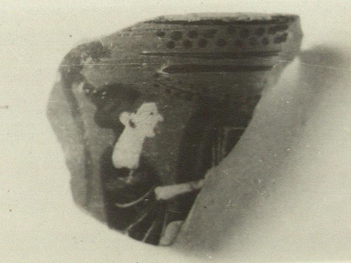 | Description: | Bit of wall with start of shoulder. Athena, helmeted and riding right, preserved to the waist. Only a part of the head of the horse remains. Vine in field. Row of two dots between glazed bands (one above, two below) at the top of the wall. On the shoulder, tips of lotus bud pattern. White for Athena's flesh; red for crest and stripes on helmet; stripes on garment and line down horse's mane. Orange wash; the glaze fired red. Joins P 2715. | |