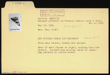 Description:   White Ground. From near center, broken all around. Head of male figure to right, holding box-like object. Another arm holding chest to right. Egg pattern in circle above.