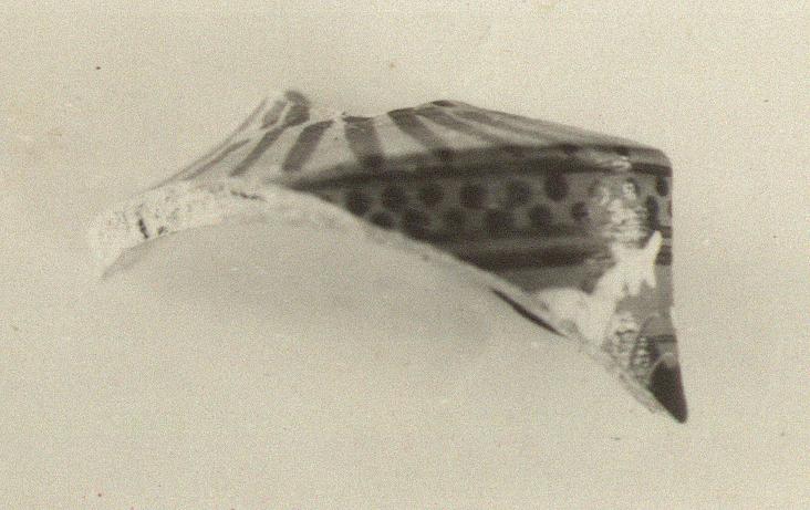| Description: | Fragment from upper part of wall and shoulder. Below a double row of black dots between bands (one above and two below), the head and shoulders of a woman. On the shoulder, double row of debased lotus bud pattern. White for woman's flesh and fruit of vine in field(?). Orange wash. | |