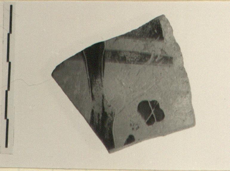 | Description: | From wall. Slight curvature. Inside unglazed; blob rosette and animal's leg (bull?) on outside. Incision and added purple. Orange clay. | |