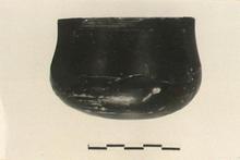 | Description: | Much of wall missing but profile complete. Restored in plaster. Several joining fragments. High wall slightly inclined inward. Flat bottom. Dull black glaze. | |