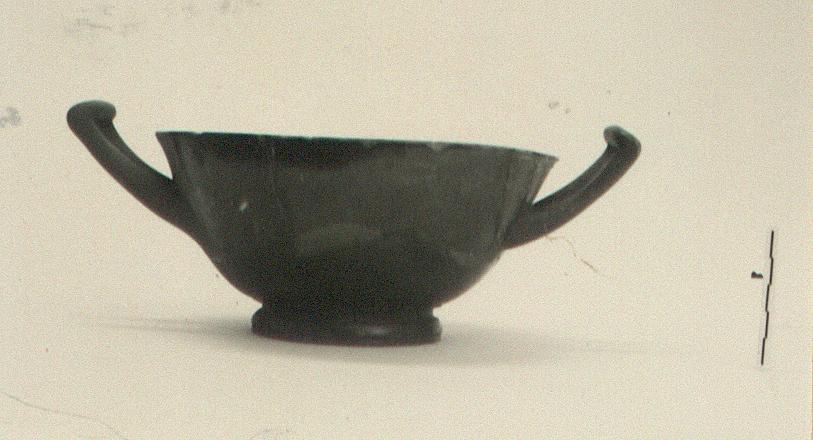| Description: | Much of wall and rim missing from one side, including handle. Six joining fragments. Restored in plaster. Deep body, lip offset inside. Moulded foot; underneath five concentric bands, one wide and four narrow, and central dot. Stamped on floor, four palmettes within a ring of ovules. The glaze has fired a rich red both inside and out except for a small area on the rim. Cf. P 27392. | |