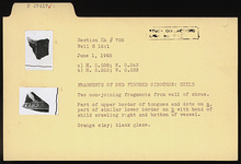 | Description: | Two non-joining fragments from wall of chous. Part of upper border of tongues and dots on a), part of similar lower border on b) with hand of child crawling right and bottom of vessel. Orange clay; black glaze. | |