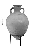 | Description: | Complete. Much chipped in lower body. Small ring foot; round body; depression at base of each handle. Wide flaring rim. Graffito on shoulder: Ε Unglazed pinkish-buff clay. | |
