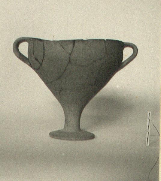 | Description: | Broken but lacks only small fragments of one handle and wall. Completely restored. Very irregular in shape. Coarse clay; unglazed. | |