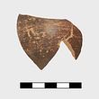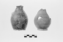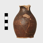 | Description: | Mouth and handle missing, but one small non-joining fragment of the mouth remains. Mended from many fragments and partially restored in plaster. Trefoil mouth, slender body; low offset foot, concave underneath. Glazed except for underside. Thin brown glaze with prominent brush strokes. Pink buff clay. | |